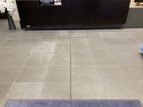 作業完了後の写真です。綺麗に除去できました。石床のシミは、何が付着したかによって、使用する洗剤や薬剤を選定する為事前の調査施工をお勧めいたします。
