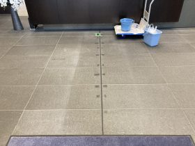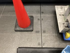 今回は石床(御影石)についたテープ跡の除去を行います。写真中央の四角いシミが今回除去するテープ跡です。体温検知モニターの配線をテープで固定していた際にできたシミです。