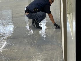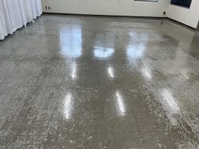 今回は福祉施設内食堂の床ワックスの剥離洗浄です。長年の汚れの積み重ねで床のワックスが真っ黒になってしまっています。