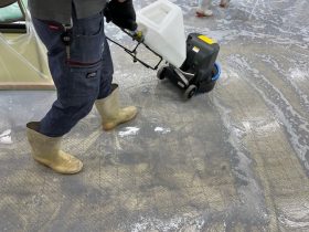 機械を用いた洗浄作業です。汚れが除去しきれるまで、洗剤撒き⇒機械洗浄⇒汚水回収のサイクルを繰り返していきます。