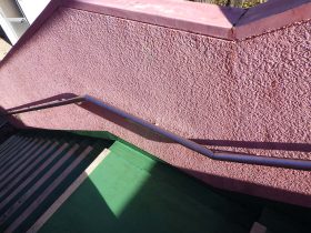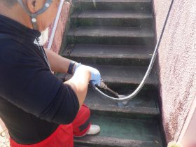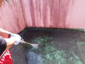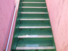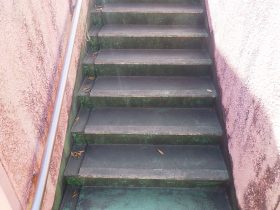 今回は保育園の非常階段床面と壁面の洗浄作業の様子をご紹介します。長年の雨風によってホコリやカビが蓄積してしまっている状態です。
