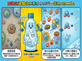 『加速化過酸化水素水』の作用メカニズムです。 最終的に水と酸素に分解されますので、安全性が高く、すすぎ不要で作業性も優れています。 ※イラストは生成AIを使って作成してみました。