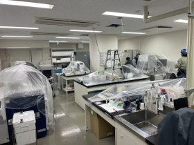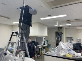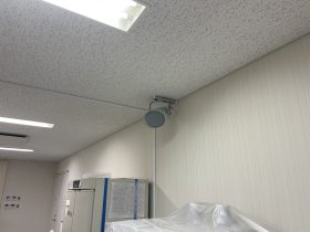 今回は館内放送スピーカー設置作業の様子をご紹介します。 まずは置かれている什器類が汚れないよう周囲に養生をしていきます。