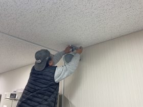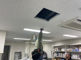 次に、天井の点検口から天井裏の状況を確認します。 設置予定箇所付近に点検口が無い場合、新たに開口部を設けるケースもあります。