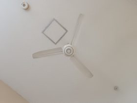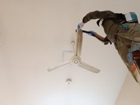 シーリングファンの清掃作業です。ほこりがこびりついてしまっているのが分かります。まずは掃除機で積もったほこりを吸っていきます。